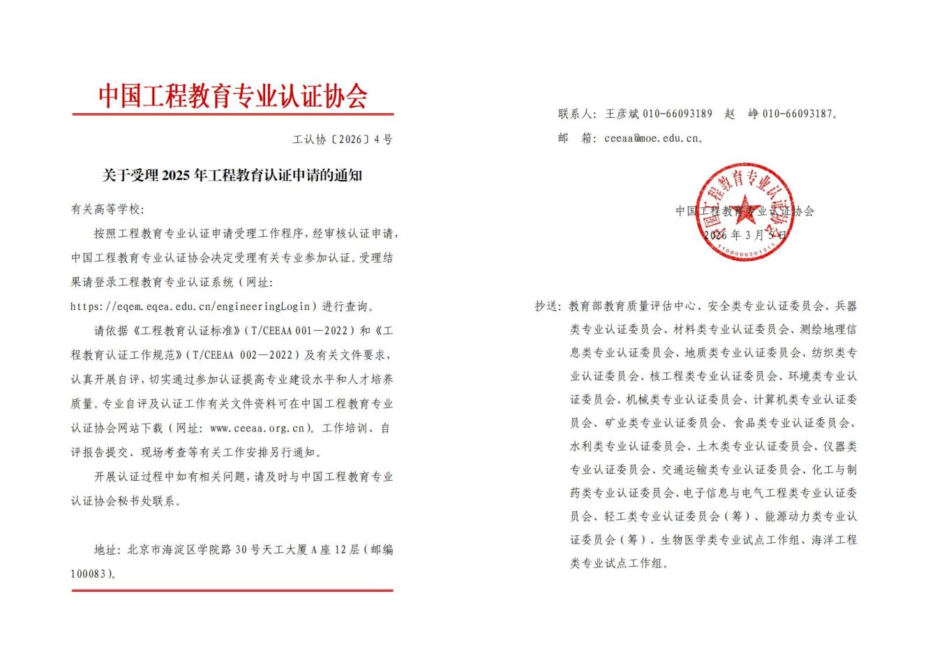近日,中国工程教育专业认证协会发布《关于受理2025年工程教育认证申请的通知》(工认协〔2026〕4号),公司计算机科学与技术专业顺利通过认证受理,标志着在软件工程专业工程教育认证后又一次取得了重要突破。